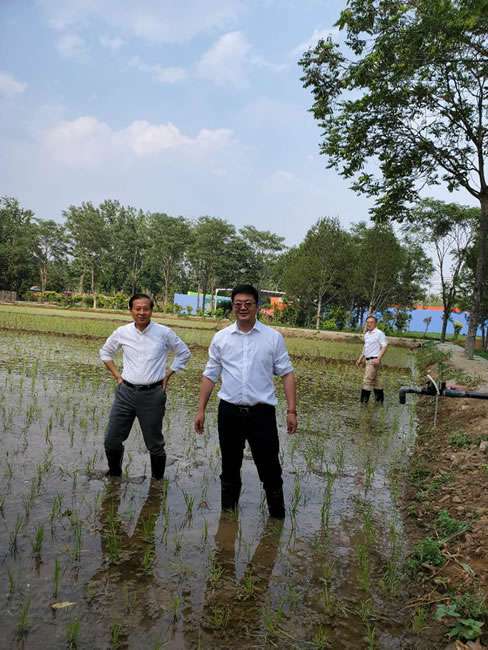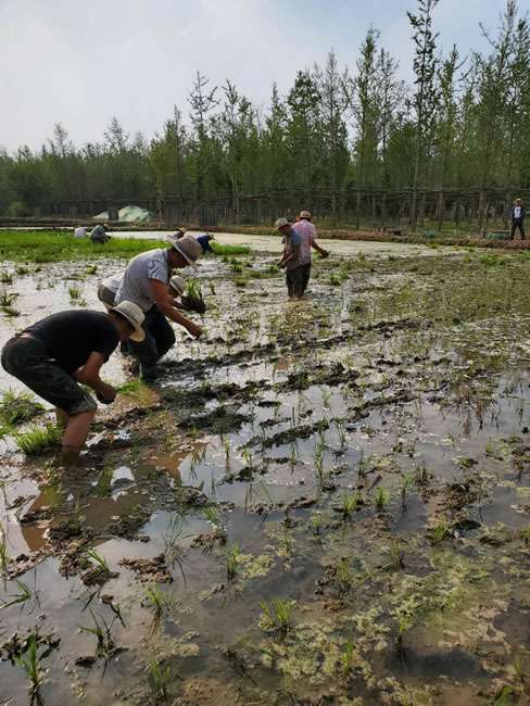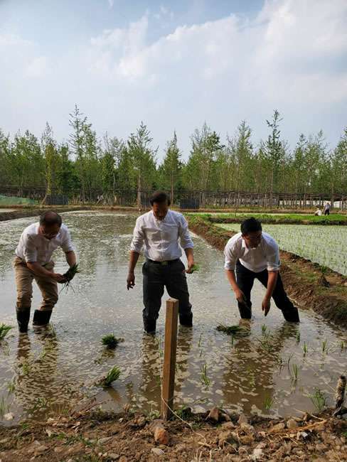 日前,太原健铭绿色清洁服务有限公司董事长梁雨、总裁谢俊率集团高级管理人员来到位于北京西四环外的锦绣大地生态园,在景色迷人的玉泉山山下,同志们挽起裤脚跃进田里,生态园农业技术员一边弓腰示范,一边讲解道“插秧是个技术活,将秧苗窝在虎口处,既要轻又要稳,用巧劲儿将秧苗抛在泥里,不能抛得太深,又要确保植保灌溉时,秧苗不漂浮在水面上。”